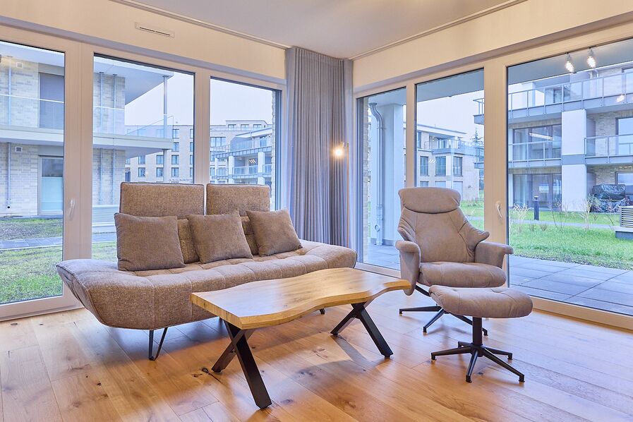 Der Wohnbereich empfängt Sie mit einer warmen, harmonischen Gestaltung und viel Licht. Hier entsteht sofort ein Gefühl von Ruhe und Komfort, das zum Ankommen und Durchatmen einlädt.