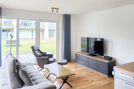 Die ca. 64 m² große Erdgeschosswohnung überzeugt mit einer geschmackvollen Ausstattung, einer großzügigen Südost-Terrasse und einem kleinen seitlichen Meerblick.