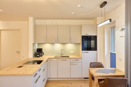 Die Küche ist so eingerichtet, dass Kochen im Urlaub Freude bereitet – funktional, modern und komplett ausgestattet. Sie fügt sich offen in den Wohnbereich ein und unterstützt mühelose kulinarische Momente.