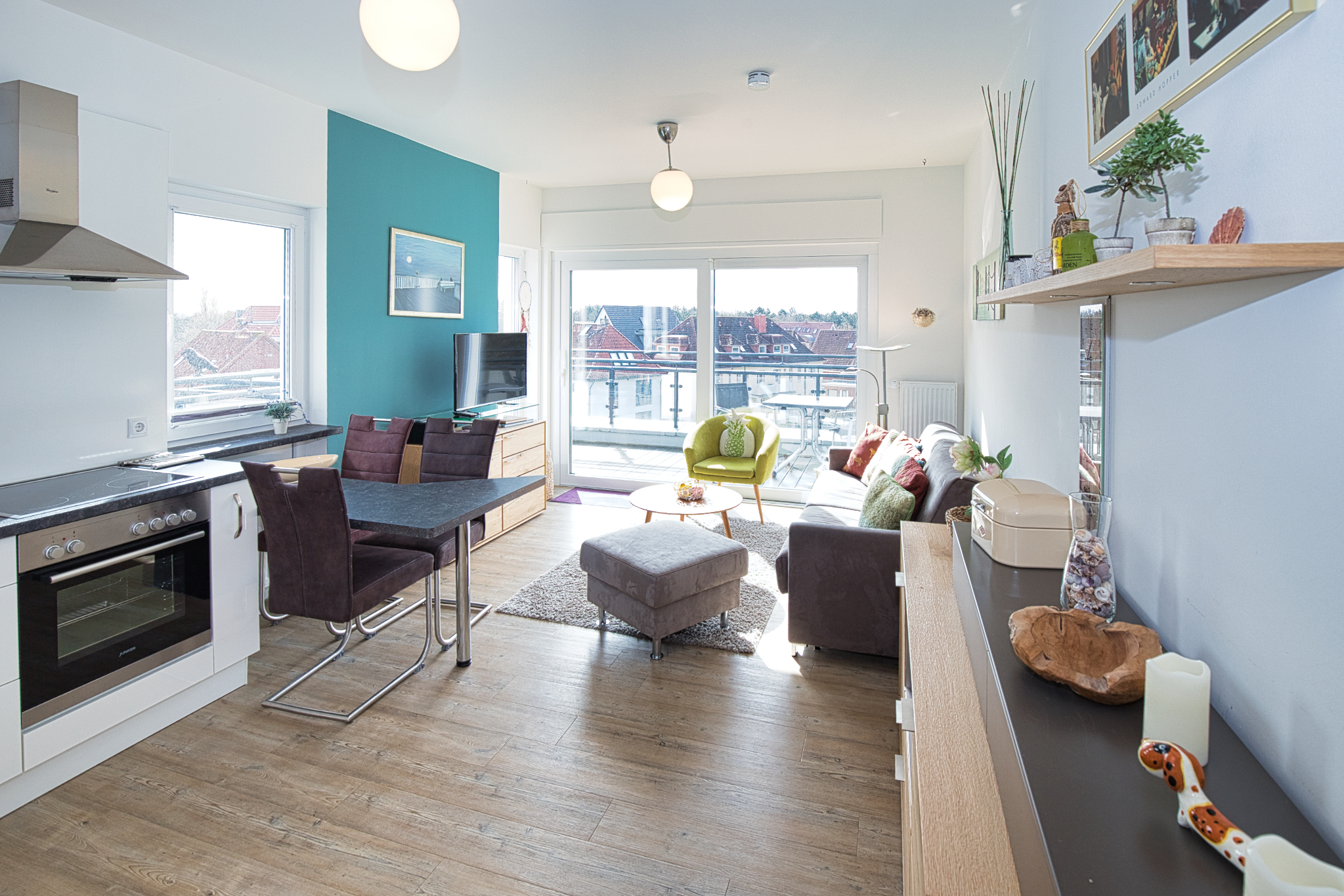 Der Wohn- und Essbereich der Wohnung beeindruckt mit seiner Gemütlichkeit und lädt zum Verweilen ein. Die komfortable Einbauküche bietet Ihnen neben modernen Geräten auch einen Cafissimo Kapsel-Automaten, um Ihren Tag mit einer köstlichen Tasse Kaffee zu beginnen. Die teilweise bodentiefen Fenster lassen viel Licht herein und bieten Ihnen einen herrlichen Ausblick. Von der Dachterrasse aus können Sie sogar einen kleinen Blick auf die Nordsee erhaschen.