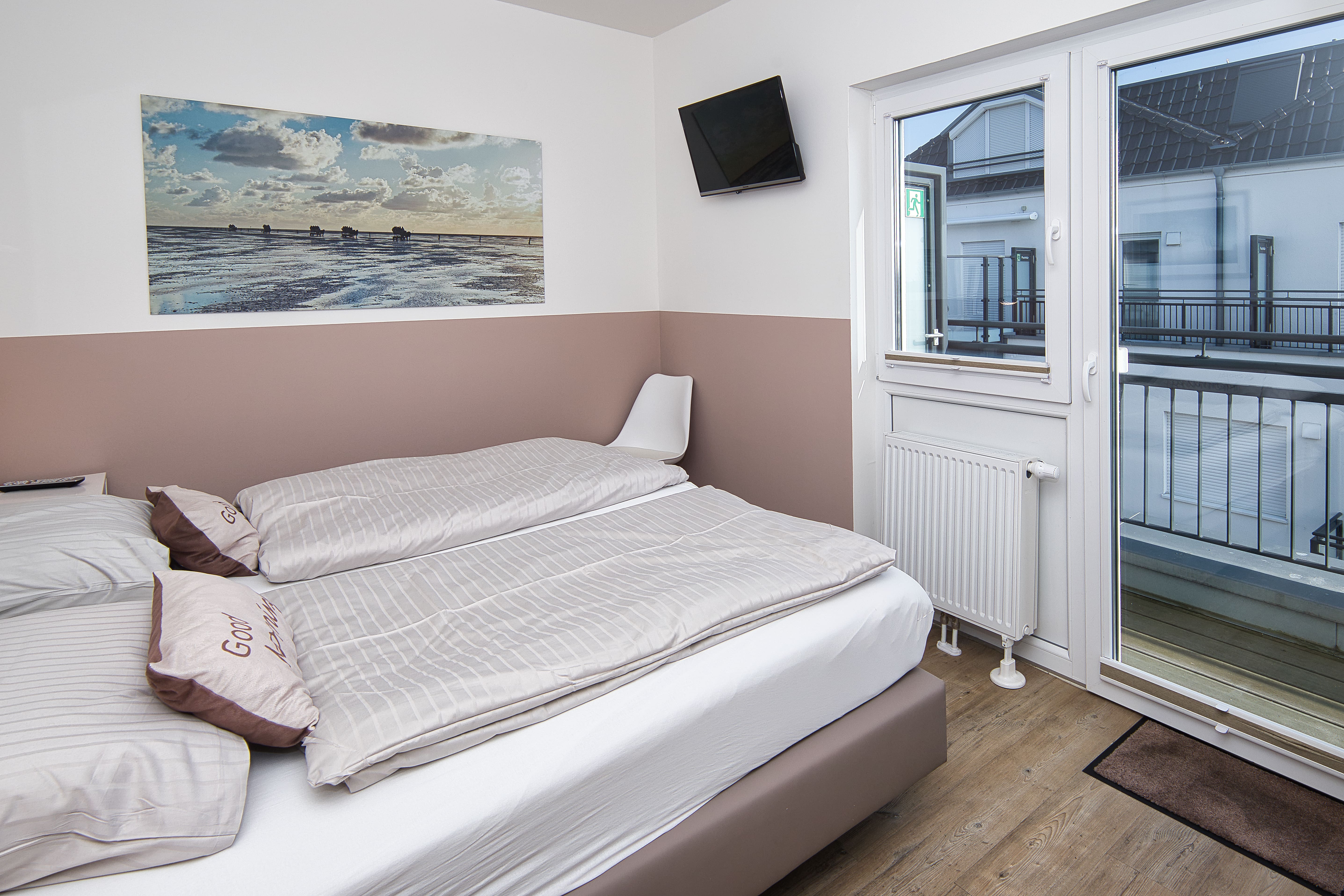 Die Nichtraucherwohnung ist besonders für Asthmatiker geeignet und bietet Platz für bis zu drei Personen. Auf der dritten Etage erwartet Sie ein helles und komfortables Ambiente mit einer großzügigen umlaufenden Dachterrasse, die über eine Markise (Süd/Ost) und Sonnenliegestühle verfügt. Bitte beachten Sie, dass das Rauchen sowohl innerhalb der Wohnung als auch auf der Dachterrasse nicht gestattet ist.
