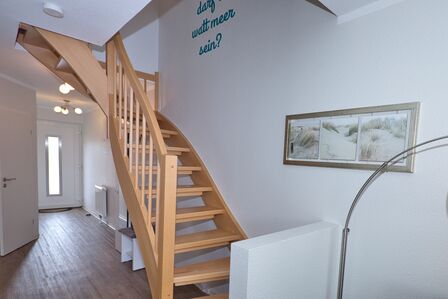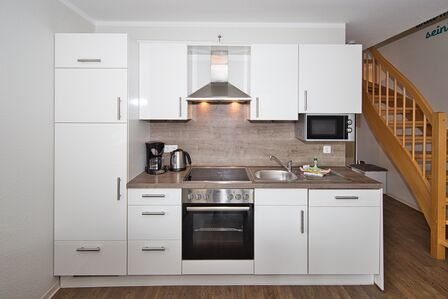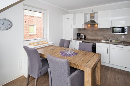 3-Zimmer Maisonette Ferienwohnung am Grooten Steen 14 in Cuxhaven-Duhnen. Es erwartet Sie hier eine geschmackvolle und moderne 3-Raum Ferienwohnung im 1. Obergeschoss mit 2 Bädern und einem großzügigen Süd-Balkon. Auf den Balkon gelangen sie über den Wohn-/ Ess- und Küchenbereich. Dieser ist großzügig aufgeteilt und bietet Platz für bis zu 4 Personen. Die Küche ist komplett ausgestattet und lässt kaum Wünsche offen. Das ebenfalls geräumige Schlafzimmer ist mit einem komfortablen Boxspring Doppelbett und genügend Stauraum ausgestattet. Für den weiteren Komfort stehen Ihnen 2 Duschbäder mit WC zur Verfügung. Das 2. Duschbad mit WC befindet sich im Dachgeschoss, wo Sie auch das 2. Schlafzimmer mit 2 Einzel Boxspringbetten finden. Genügend Stauraum ist in beiden Schlafzimmern vorhanden. Weiteren Komfort erfahren Sie durch die tolle Ausstattung z.B. in Schlafbereich im DG mit TV.