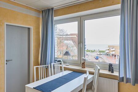 Das großzügige Fenster im Norden der Ferienwohnung bietet einen herrlichen und stets interessanten Blick auf die Nordsee und die Fußgängerzone Strandstraße mit ihren Straßencafés und Geschäften. Von Ihrer bequemen Couchgarnitur und auch von der Essecke aus können Sie diesen Blick in vollen Zügen genießen. Am Horizont lassen sich die Schiffe in der Fahrrinne erkennen.