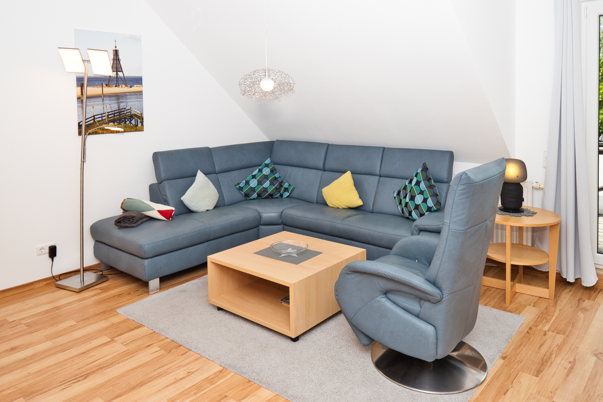 Im 1. OG kommen Sie über den Flur direkt in den hellen Wohn- und Essbereich mit einer gut ausgestatteten Einbauküche, einem Essbereich für 4 Personen und dem Zugang zum Balkon. Eine mobile Tischleuchte, mit WiFi Speaker und Bluetooth Lautsprecher lässt Sie Ihre eigenen Musiklisten abspielen. Vom Flur aus gelangen Sie in das große Duschbad mit WC und Waschmaschine, sowie ins Schlafzimmer mit Doppelbett und einem großen Kleiderschrank. Vom Wohnbereich, mit einer gemütlichen und hochwertigen Eckcouch und einem TV Sessel, führt Sie eine gut begehbare Holztreppe ins Dachgeschoss. Hier befindet sich ein kleineres Schlafzimmer mit einem Doppelbett. Ebenfalls befindet sich auf dieser Etage ein 2. Duschbad mit WC. Wir wünschen Ihnen einen schönen Urlaub.