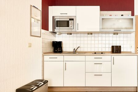 Die gut ausgestattete Küchenzeile lädt dazu ein, kleine Köstlichkeiten zu zaubern oder morgens gemütlich zu frühstücken. Mit einem Geschirrspüler, 2 Ceranfeld Kochplatten und einem Kühlschrank mit Gefrierfach steht Ihnen alles zur Verfügung, um Ihren Aufenthalt angenehm zu gestalten.