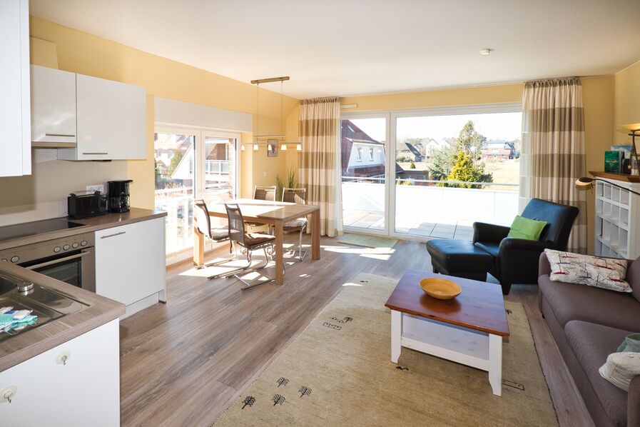 Dünenflair. FeWo 7. Eine luxuriöse 2-Raum Ferienwohnung auf 58m² erwartet Sie hier. Ein wunderschöner Neubau wurde hier geschaffen. Die Wohnung, welche großzügig geschnitten ist befindet sich im 1.OG und erstreckt sich auf ein geräumigen Eingangsbereich mit Garderobe und einem kleinen Abstellraum. Vom Flur aus kommen Sie ebenso ins Badezimmer mit einer tollen Runddusche, sowie in das geräumige Schlafzimmer mit einem großen Kleiderschrank und einem Abstellbereich für Ihre Koffer, sowie einer Sitzbank. Der offene Flur führt direkt in den hellen Wohn- und Essbereich mit Blick auf Felder und Wiesen. Der große Westbalkon mit Balkonmöbeln wird Sie begeistern. Die Einbauküche ist hochwertig und komplett ausgestattet. Die großzügige Gartenanlage, die dem Haus ihren Namen -Dünenflair- gab, verschafft zusätzliche Freiräume. Hier wurde auch eine Grillecke angelegt. Urlaub erleben.