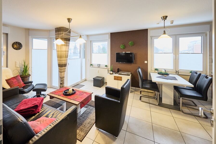 Diese sehr schöne und hochwertig eingerichtete Ferienwohnung (Wohn- und Essbereich mit einer Schlafcouch mit einem vollwertigen Bettauszug, Flur und Duschbad komplett Allergiker freundlich) unmittelbar am ahoi! Bad gelegen, ist mit einem gemütlichen Schlafzimmer mit großem Kleiderschrank, einem barrierefreien Duschbad (Dusche/WC), einem Abstellraum (für Ihre Koffer befindet sich noch ein Abstellraum im Kellerbereich des Hauses) aufgeteilt. Im Wohn- und Essbereich mit einer sehr gut ausgestatteten Einbauküche und dem barrierefreien Zugang zum Balkon mit Windschutz (mit Balkonmöbeln und einem kleinen Strandkorb) können Sie den Tag genießen.