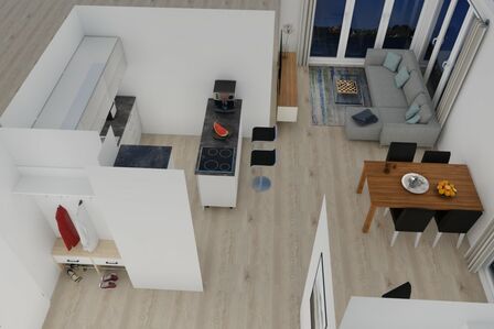 Der offene Wohn- und Essbereich ist hell, modern und wertig eingerichtet. Bodentiefe Fenster schaffen eine freundliche, lichtdurchflutete Atmosphäre und führen direkt hinaus auf die großzügige Dachterrasse.