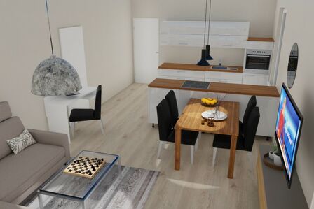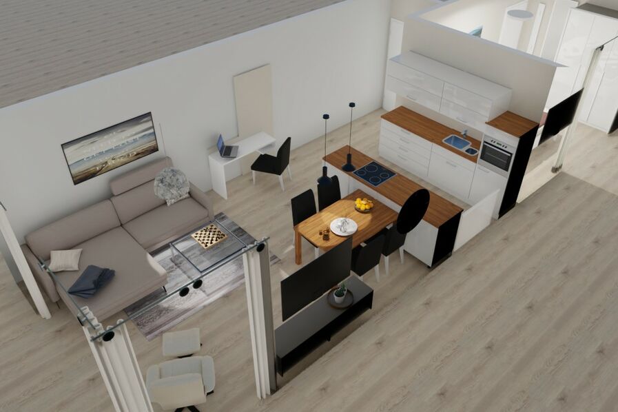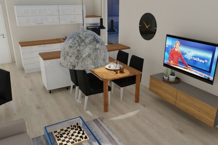 Der offen gestaltete Wohn- und Essbereich ist modern eingerichtet und verfügt über ein bequemes Sofa, Sessel sowie einen großen Flachbild-TV. Die angrenzende Einbauküche ist mit Induktionskochfeld, Backofen, Kühlschrank mit Gefrierfach, Geschirrspüler sowie Pad- und Filterkaffeemaschine vollständig ausgestattet. Der Esstisch bietet ausreichend Platz für gemeinsame Mahlzeiten.