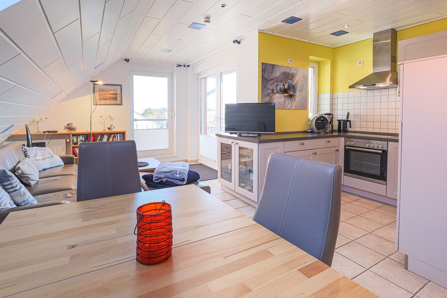 Über eine Treppe im Wohnungsflur erreichen Sie das gemütliche Dachgeschoss, in dem sich ein zweiter Schlafbereich mit zwei Einzelbetten sowie eigenem TV-Gerät befindet. Für wohlige Wärme sorgt ein Elektroheizkörper.