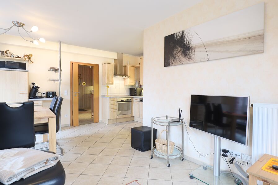 Schon der großzügige Eingangsbereich vermittelt ein angenehmes Wohngefühl. Von hier aus gelangen Sie in das erste Schlafzimmer mit Doppelbett und großem Kleiderschrank, ein helles Duschbad mit Bidet und WC sowie den offenen Wohn-, Ess- und Küchenbereich. Die stilvoll eingerichtete Küche mit Dunstabzug nach außen lässt keine Wünsche offen. Am großen Esstisch finden bis zu fünf Personen bequem Platz, ein weiterer Stuhl kann hinzugestellt werden, und die gemütliche Sofaecke mit Terrassenzugang lädt zum Entspannen ein.