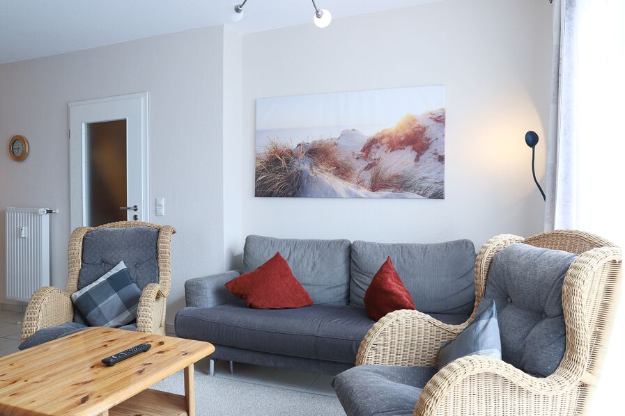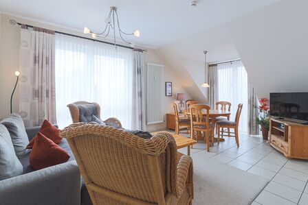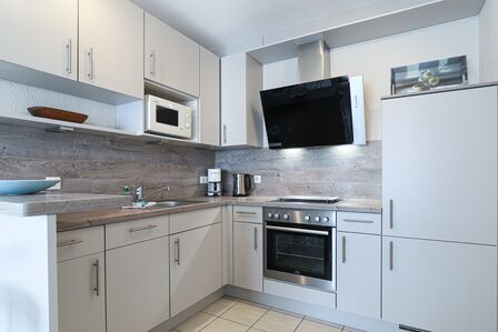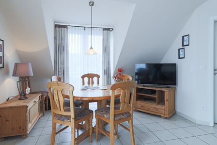 Im oberen Wohnbereich erwartet Sie ein offener, großzügiger Wohn-, Ess- und Küchenbereich mit direktem Zugang zum Westbalkon – hier genießen Sie die Nachmittagssonne in vollen Zügen nach einem Spaziergang am Meer. Die Einbauküche ist komplett ausgestattet und lädt zu gemeinsamen Kochmomenten ein. Ebenfalls im Dachgeschoss befindet sich ein praktisches Gäste-WC.