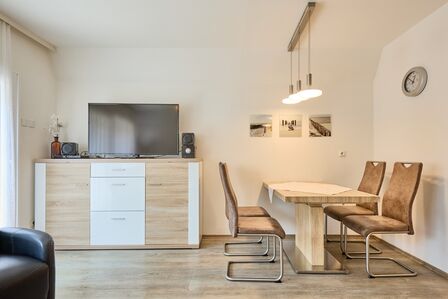 Willkommen im "Ferienhaus Am Ringwall 32 - Fritzi"! Hier erwartet Sie ein idyllisches Refugium für Ihren Nordseeurlaub. Auf großzügigen 54 m² bietet unser Ferienhaus Platz für bis zu 4 Personen und verfügt über 2 gemütliche Schlafzimmer sowie ein Duschbad. Im Wohnbereich erwartet Sie eine behagliche Atmosphäre, wo Sie in der Essecke Ihre Mahlzeiten genießen oder im komfortablen Sofabereich vor dem Fernseher entspannen können. Durch eine elegante Glasschiebetür gelangen Sie auf Ihre sonnige Westterrasse, wo Sie die frische Nordseeluft in vollen Zügen genießen können.