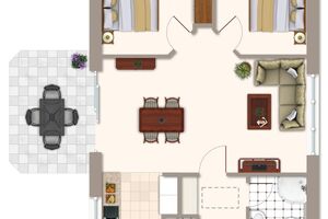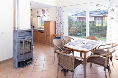 Die großzügige Wohnfläche beträgt ca. 68 qm und vom lichtdurchfluteten Wohnbereich mit offener Küche gelangt man auf die sonnige Westterrasse, die mit bequemen Möbeln und einem schicken Sonnenschirm ausgestattet ist. Das Haus bietet ein Duschbad mit WC und ein zusätzliches Gäste-WC. Die beiden Schlafzimmer sind durch das geräumige Wohnzimmer getrennt. Die wohlige Wärme im Haus wird durch Elektroheizkörper erzeugt, die Energie dafür stammt aus der eigenen PV-Anlage des Hauses. Außenjalousien sorgen für zusätzlichen Komfort.