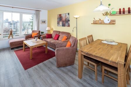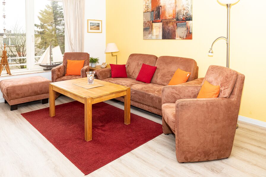 Duhnen, Rugenbargsweg 68. In diesem gemütlichen und schön gelegenen 3-Raum Ferienquartier erwarten Sie helle Räume für bis zu 4 Personen. Die Ferienwohnung ist komplett mit Laminat ausgestattet und daher Allergiker freundlich. Der Wohn- und Essbereich ist ausgestattet mit einem großen Esstisch und einem Wohnbereich mit Couch und 2 Sesseln. Der Zugang zum Westbalkon mit schönem Blick erfolgt vom Wohnzimmer. Die beider Schlafzimmer sind einmal mit einem Doppelbett und einmal mit 2 Einzelbetten eingerichtet. Beide haben einen Kleiderschrank, so dass auch für die längere Reisezeit für Platz gesorgt ist. Die neue Einbauküche mit Geschirrspüler befindet sich im großen Eingangsbereich der Wohnung. Das moderne Duschbad mit fast bodentiefer Dusche, Fußbodenheizung, Handtuchheizkörper, ein großer Spiegelschrank und WC und Fenster ist in 2018 komplett neu saniert worden. Im Haus befindet sich noch eine gemeinschaftlich genutzte, gebührenpflichtige Sauna mit Ruheraum.