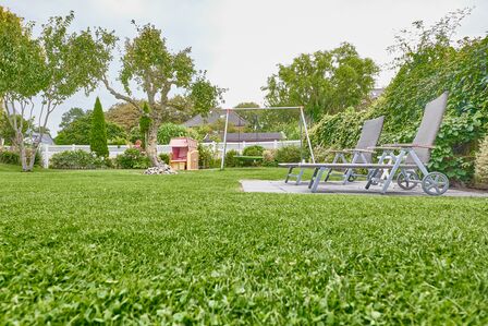 - Großer Gemeinschaftsgarten mit Terrasse, Gartenmöbeln und Strandkörben
