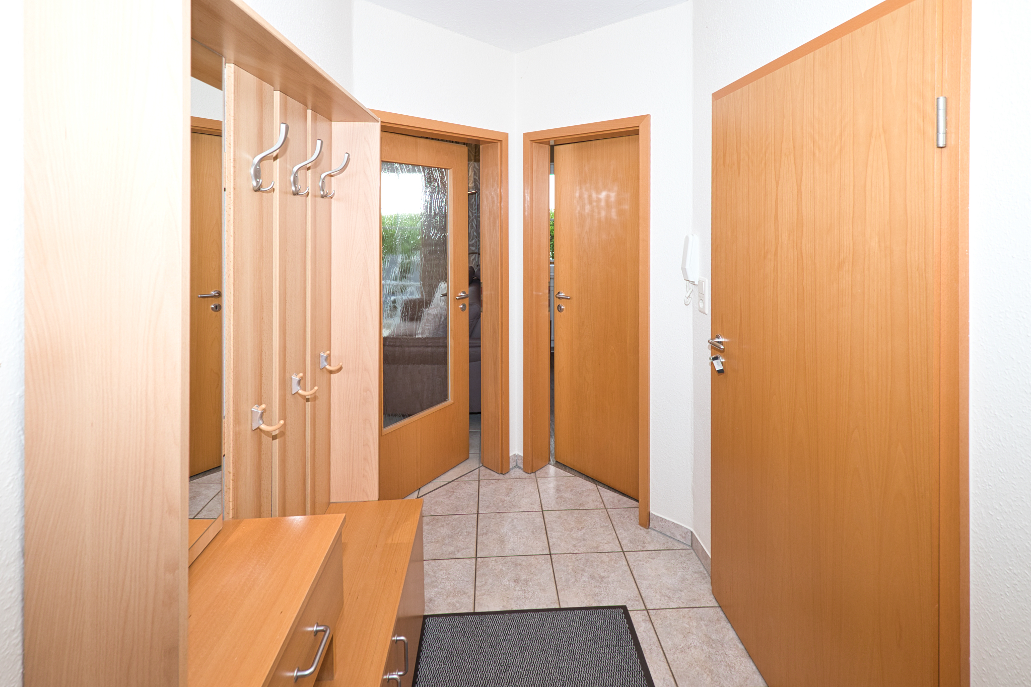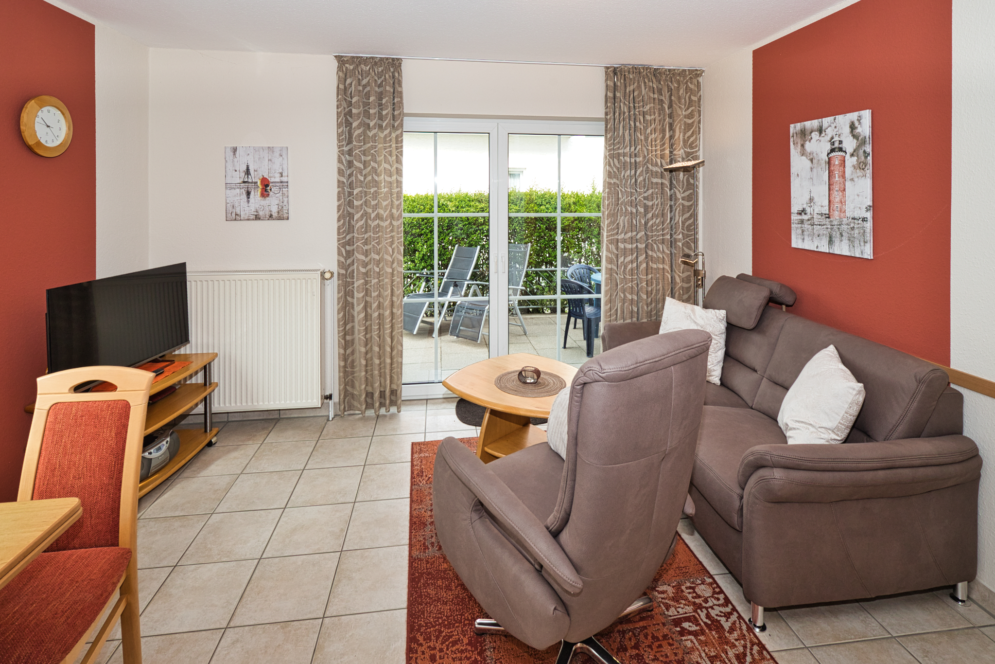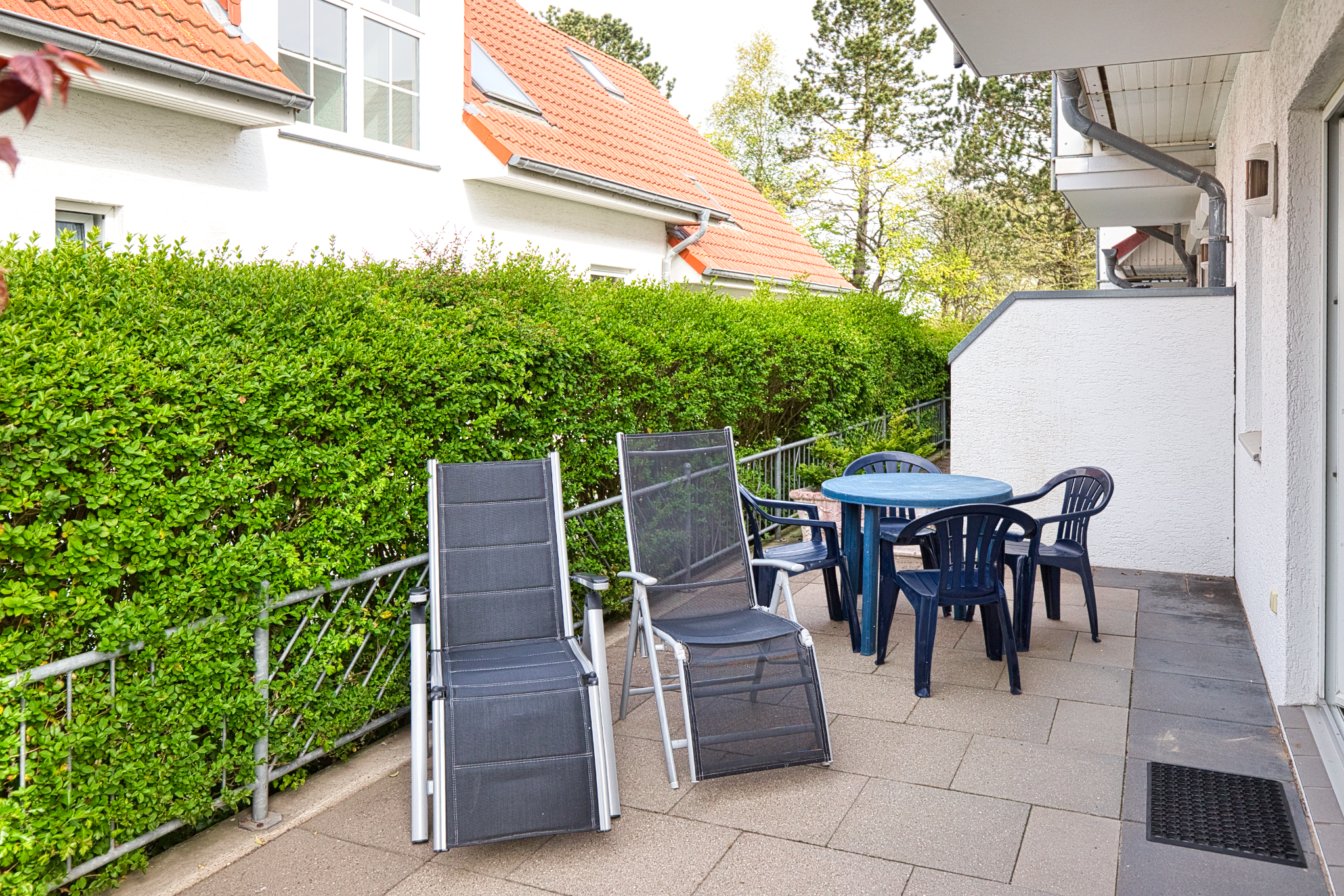 Neptun 10, Whg. 1, 3-Raum, EG, ca. 52m², bis zu 4 Personen. Die gemütliche Ferienwohnung besticht durch seine gute strandnahe Lage und ist für bis zu 4 Personen geeignet und ist aufgeteilt mit einem separaten Schlafzimmer mit einem Doppelbett, einem "Kinderzimmer" mit einem Etagenbett (90cmx200cm), einem hellen Duschbad (Dusche/WC), dem Wohnbereich mit Zugang zur Terrasse mit integriertem Essbereich und der komfortablen Einbauküche. Die gemütliche und sonnige Terrasse mit Terrassenmöbeln laden zum urlauben ein.