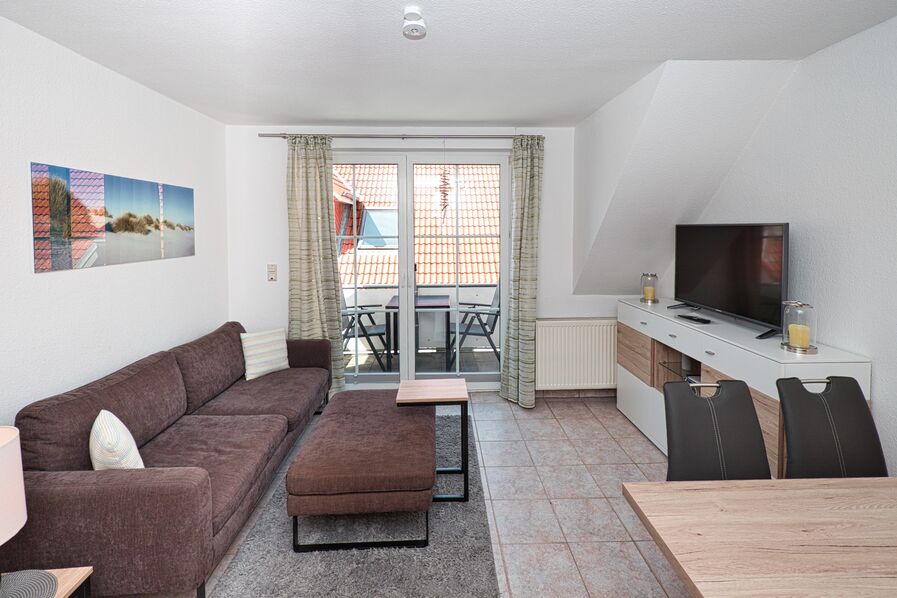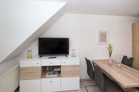 Herzlich willkommen in der modernen 3-Raum Ferienwohnung Neptun 10, Whg. 5, direkt am Freibad Steinmarne gelegen! Diese einladende Wohnung erstreckt sich über das 1. Obergeschoss und das Dachgeschoss, bietet ca. 60m² Wohnfläche und beherbergt bis zu 4 Personen. Für die kleinen Gäste gibt es sogar einen kleinen Spielbereich im Dachgeschoss.