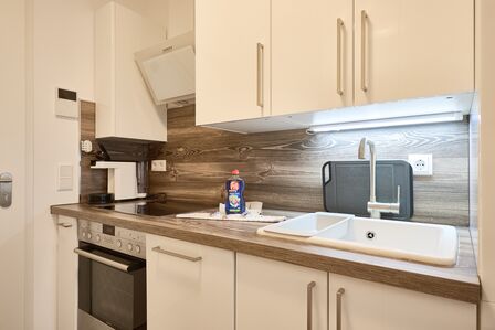 - Küche: Induktionskochfeld, Mikrowelle, Backofen, Geschirrspüler, Kühlschrank
