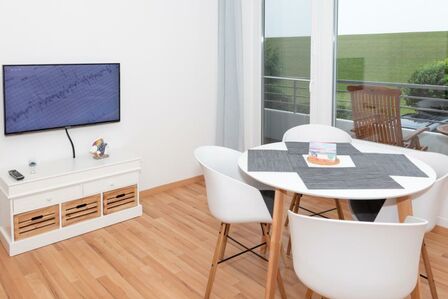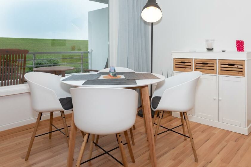 Direkt im Eingangsbereich der Wohnung befindet sich die separate Küche. Dieses ist mit einer Waschmaschine, einem Trockner und Geschirrspüler, Kühlschrank mit Gefrierschrank sehr gut eingerichtet. Der Essbereich im Wohnzimmer integriert, bietet genügend Platz für ein ausgiebiges Urlaubsessen, welches auch auf dem schönen Balkon serviert werden kann. Auch wenn Sie hier keine Seesicht genießen, die direkte Deichnähe lässt Sie entspannen. Wenige Schritte und Sie sind auf der der Deichkrone und haben das Wasser zum greifen nahe. Das Bojenbad in der Grimmershörnbucht ist nur wenige Meter entfernt.