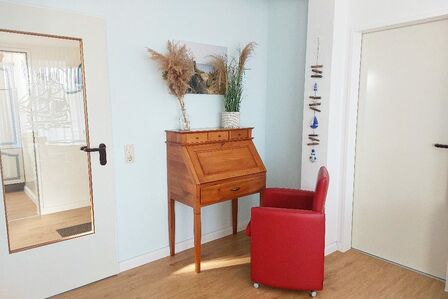 Die Ferienwohnung empfangt Sie in der Diele, großzügig mit Garderobe und dem Zugang zur Küche, zum Duschbad und zum Wohnbereich. Eine Waschmaschine, Kühlschrank mit Gefrierfach befinden sich direkt in der mit vielen Ablagen gut ausgestatteten Küche. Der Essbereich, der sich im Wohnzimmer befindet, bietet auch für ein Frühstücksbrunch genügend Platz am Tisch und wenn es das Wetter zulässt wird am Abend der Wein auf dem Balkon ausgeschenkt. Auch wenn Sie hier keine Seesicht genießen, die direkte Deichnähe lässt Sie entspannen. Wenige Schritte und Sie sind auf der der Deichkrone und haben das Wasser zum greifen nahe. Das Bojenbad in der Grimmershörnbucht ist nur wenige Meter entfernt.
