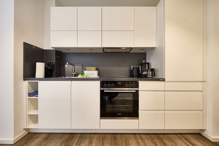 - Küche: Induktionskochfeld, Mikrowelle, Geschirrspüler, Kühlschrank mit Gefrierfach