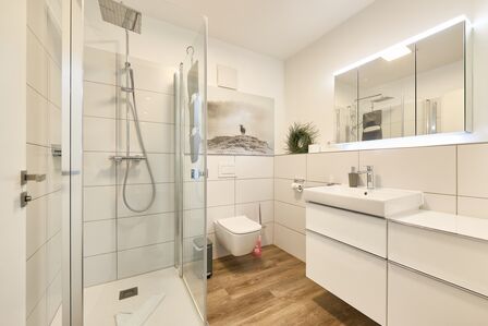 - Duschbad: Modernes Bad mit ebenerdiger Dusche, WC, Handtuchheizkörper