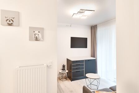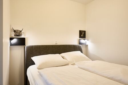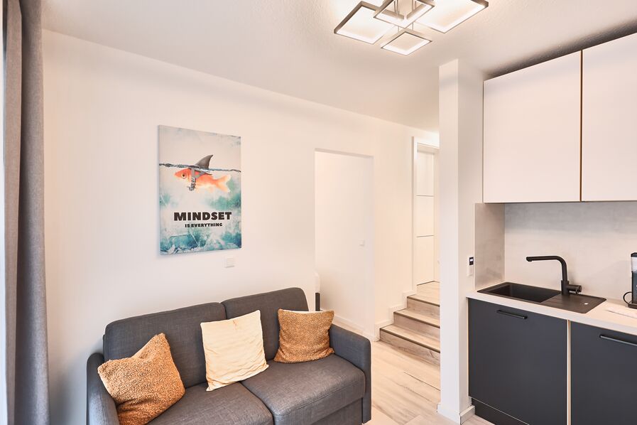 Das Studioappartement überzeugt durch ein modernes Design und eine durchdachte Raumaufteilung. Der separate Schlafbereich sorgt für erholsame Nächte. Im einladenden Küchen-, Wohn- und Essbereich können Sie nach einem Tag am Strand entspannen. Der Essbereich ist ausziehbar und lässt sich je nach Bedarf optimal anpassen. Direkt an den Wohnbereich grenzt die Terrasse, die zum Bürgersteig zeigt und von dort haben Sie Zugang zum PKW-Stellplatz.