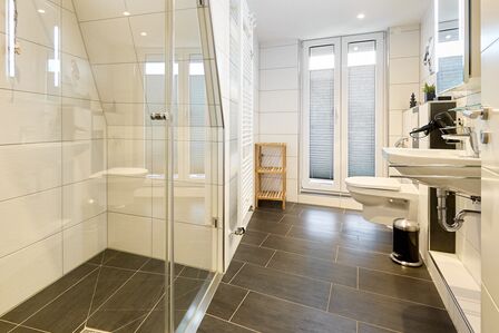 Auf dieser Etage befinden sich außerdem ein Schlafzimmer mit Doppelbett, das Zugang zu einem Südbalkon bietet, sowie ein helles Duschbad mit Fenster. Das Badezimmer ist mit einer bodengleichen Dusche, einem modernen WC und hochwertigen Details ausgestattet.
