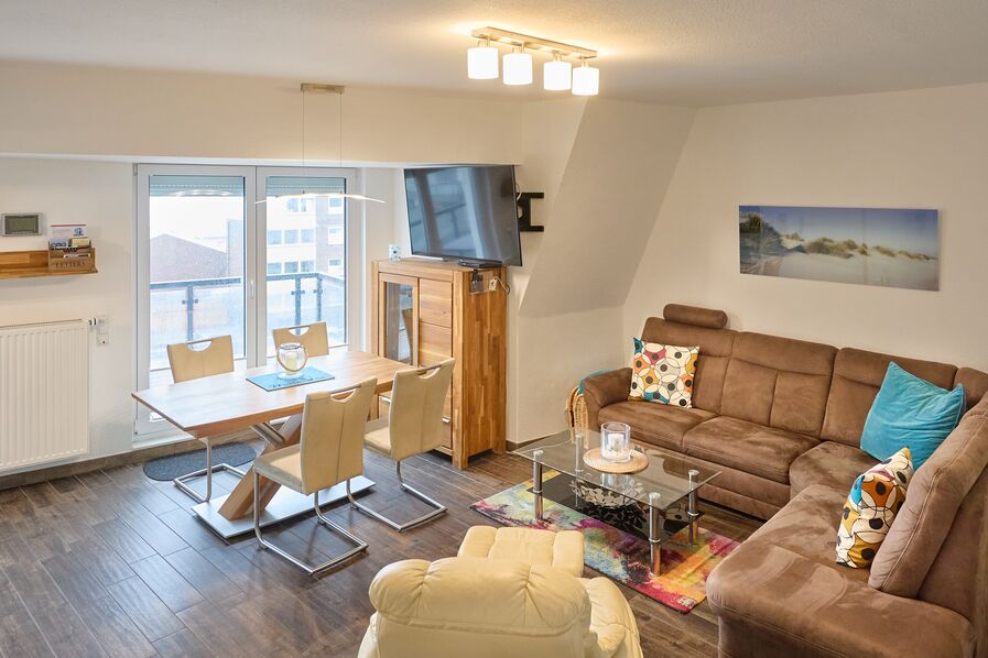 Die Ferienwohnung Nr. 4 befindet sich im zweiten Gebäude in der zweiten Reihe und erstreckt sich über zwei Etagen. Sie bietet Platz für bis zu vier Personen, maximal fünf Personen, wenn im Dachgeschoss ein Bett von zwei Kindern genutzt wird. Der Wohn- und Essbereich liegt im dritten Obergeschoss und überzeugt mit modernem Design und einer gemütlichen Atmosphäre. Eine offene Einbauküche mit allem Komfort – darunter ein Ceranfeld, Backofen und Geschirrspüler – ist nahtlos in den Wohnbereich integriert und ideal für die Zubereitung gemeinsamer Mahlzeiten. Vom Balkon aus genießen Sie eine traumhafte Seesicht über die Dächer von Duhnen – der perfekte Ort für ein entspanntes Frühstück oder einen erholsamen Abend.