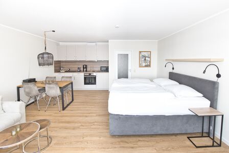 Das Ferienappartement ist für 2 Personen optimal ausgestattet und bietet Ihnen Platz auf ca. 50qm. Wohn-, Ess- und Schlafbereich sind sehr gut aufgeteilt. Der Schlafbereich verfügt über ein Boxspringbett mit Lesebeleuchtung. Im Wohn- und Essbereich erwarten Sie bequeme Sitzgelegenheiten und bietet Ihnen mit Smart-TV, DAB+ Radio und dem Blick nach draußen ein großartiges Urlaubsambiente. Damit Sie sich aber auch zu dritt wohlfühlen können, steht Ihnen im Wohnbereich eine Schlafcouch mit einer ca. 130cm breiten Liegefläche zur Verfügung.