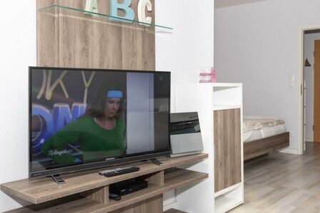 Der kombinierte Wohn-, Ess- und Schlafbereich wurde praktisch gestaltet und verbindet mehrere Funktionen in einem Raum. Das Doppelbett ist in einer Nische integriert, was eine klare räumliche Struktur schafft, ohne den Wohnbereich zu sehr einzuschränken. Eine Couch, TV und DVD-Player ermöglichen entspannte Stunden nach einem Strandtag, und durch die Terrassentür gelangt man direkt auf die sonnige Westterrasse.