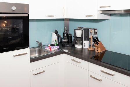 • Die Küche ist klein, aber für den Ferienalltag ausreichend ausgestattet. Sie fügt sich offen in den Wohnraum ein und bietet Platz für gemeinsame Mahlzeiten.