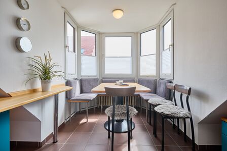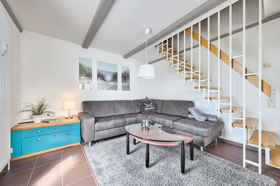 Liebe Nordseeurlauber, aufgepasst! Unsere Ferienresidenz Steinmarne beherbergt eine ca. 53 m² große Wohnung, ein perfekter Rückzugsort für Ihren Cuxhaven-Urlaub. Die stilvolle Einrichtung und die offene Küche schaffen eine einladende Atmosphäre im Wohnbereich. Entspannen Sie in unserem ausgebauten Erker mit gemütlicher Sitzbank und einer großzügigen Couch.