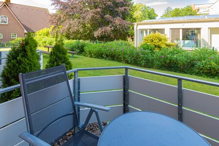 Das Schlafzimmer ist mit einem gemütlichen Doppelbett und einem geräumigen Kleiderschrank ausgestattet. Von hier gelangen Sie direkt auf den Balkon, auf dem Sie die frische Nordseeluft genießen können – ein perfekter Ort für einen entspannten Start in den Tag. Handtücher können bei Bedarf gegen eine kleine Gebühr bereitgestellt werden.