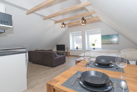 Sahlenburger Weg 17 - Es erwartet Sie eine helle, sehr gemütliche 1-Raum Ferienwohnung mit offenen Dachbalken und stimmungsvoller Deckenbeleuchtung. Ein wunderbares Doppelbett ist in dem gemütlichen Appartement bestens integriert und die Fußbodenheizung sorgt für behagliche Wärme. Alle Fenster verfügen über Plissees, Rollläden und Fliegengitter. Die Küche ist voll ausgestattet, das Bad verfügt über eine ebenerdige Dusche. Fahrräder können je nach Platz im Fahrradraum, wo sich auch eine Waschmaschine für Sie befindet oder hinter dem Haus abgestellt werden. Auch befindet sich am Haus in Süd/Ost Lage eine schöne Terrasse mit Sitzmöbeln, zur Entspannung z.B. nach einem schönen Strandtag für Sie.