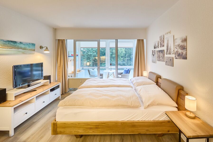 Der Schlafbereich ist mit einem bequemen Doppelbett und Nachtschränken, sowie Radio und TV ausgestattet, sodass Sie sich nach einem langen Tag am Strand bestens erholen können. Der Kleiderschrank befindet sich dafür im Eingangsbereich. Das Appartement liegt unmittelbar am Strand und bietet Ihnen eine ruhige Lage am Dünenweg. Die Duhner Heide ist nicht weit entfernt, und auch das Duhner Zentrum mit dem malerischen Dorfbrunnen erreichen Sie in wenigen Minuten.
