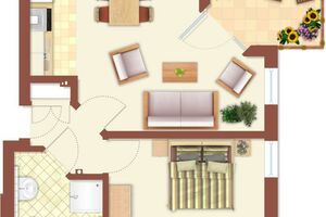 Strandburg, Whg. 4, 2-Raum, ca. 46m², Erdgeschoss, barrierefreie Wohnung mit Terrasse, bis zu 3 Personen, einfach Urlauben. Diese sehr schöne Ferienwohnung (komplett allergikerfreundlich) ist mit einem gemütlichen Schlafzimmer mit großem Kleiderschrank, einem Duschbad (Dusche/WC), einem Abstellraum (für Ihre Koffer) aufgeteilt. Im Wohn- und Essbereich mit einer sehr gut ausgestatteten Einbauküche und Zugang zur Terrasse können Sie den Tag genießen.