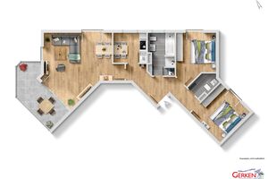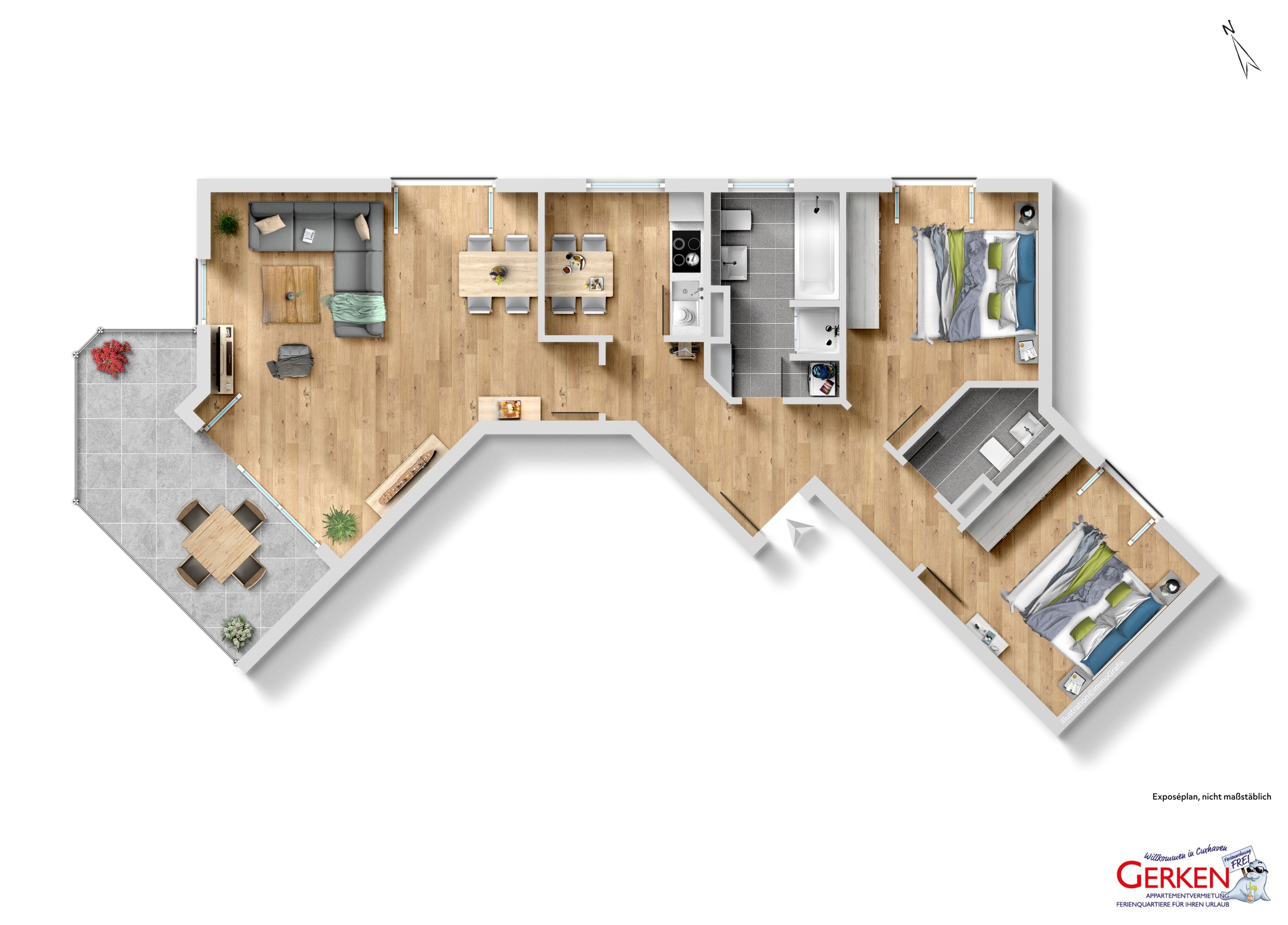 Die helle 3-Raum-Wohnung bietet auf ca. 87 m² stilvollen Wohnkomfort. Zwei Schlafzimmer mit komfortablen Doppelbetten sorgen für erholsame Nächte. Das moderne Tageslichtbad verfügt über Badewanne und Dusche, ein separates WC ergänzt den Komfort. Der lichtdurchflutete Wohn- und Essbereich lädt mit Blick auf die Nordsee zum Verweilen ein. Vom Wohnbereich gelangen Sie auf den großzügigen Balkon mit herrlichem Meerblick – ideal für Frühstück oder einen Kaffee am Morgen.